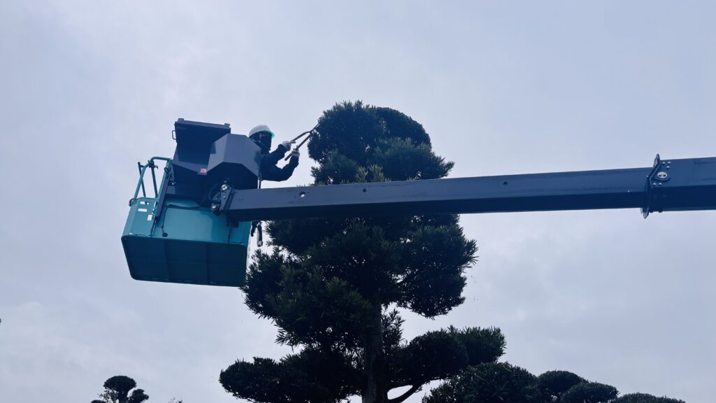高さのある樹木については、高所作業車を使用して作業を行っています。高所作業車を活用することで、地上からでは手の届かない高い位置でも安全に作業を行うことができ、効率よく剪定を進めることが可能になります。作業員の安全確保はもちろんのこと、作業精度の向上にもつながるため、現場に応じて適切に活用しています。