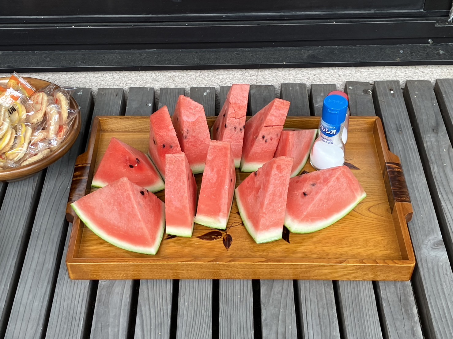 縁側の木陰で食べるスイカは甘くて、みずみずしく塩をかけて食べると、とてもおいしく4切れも食べました。