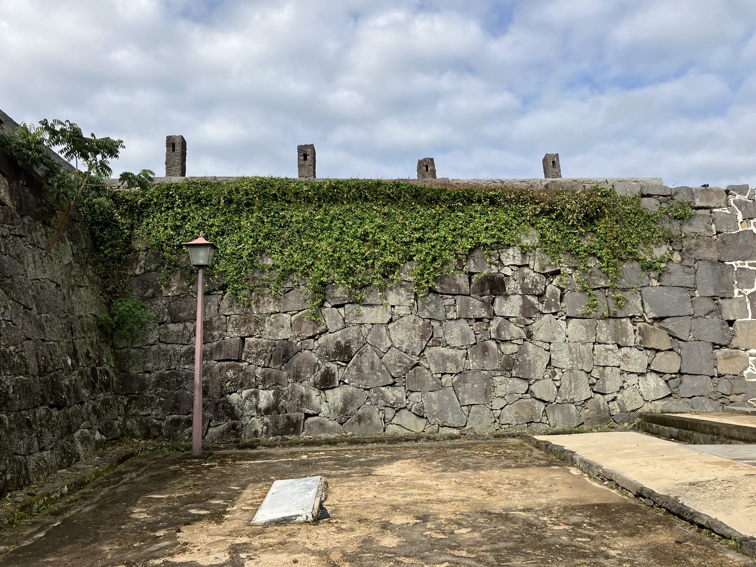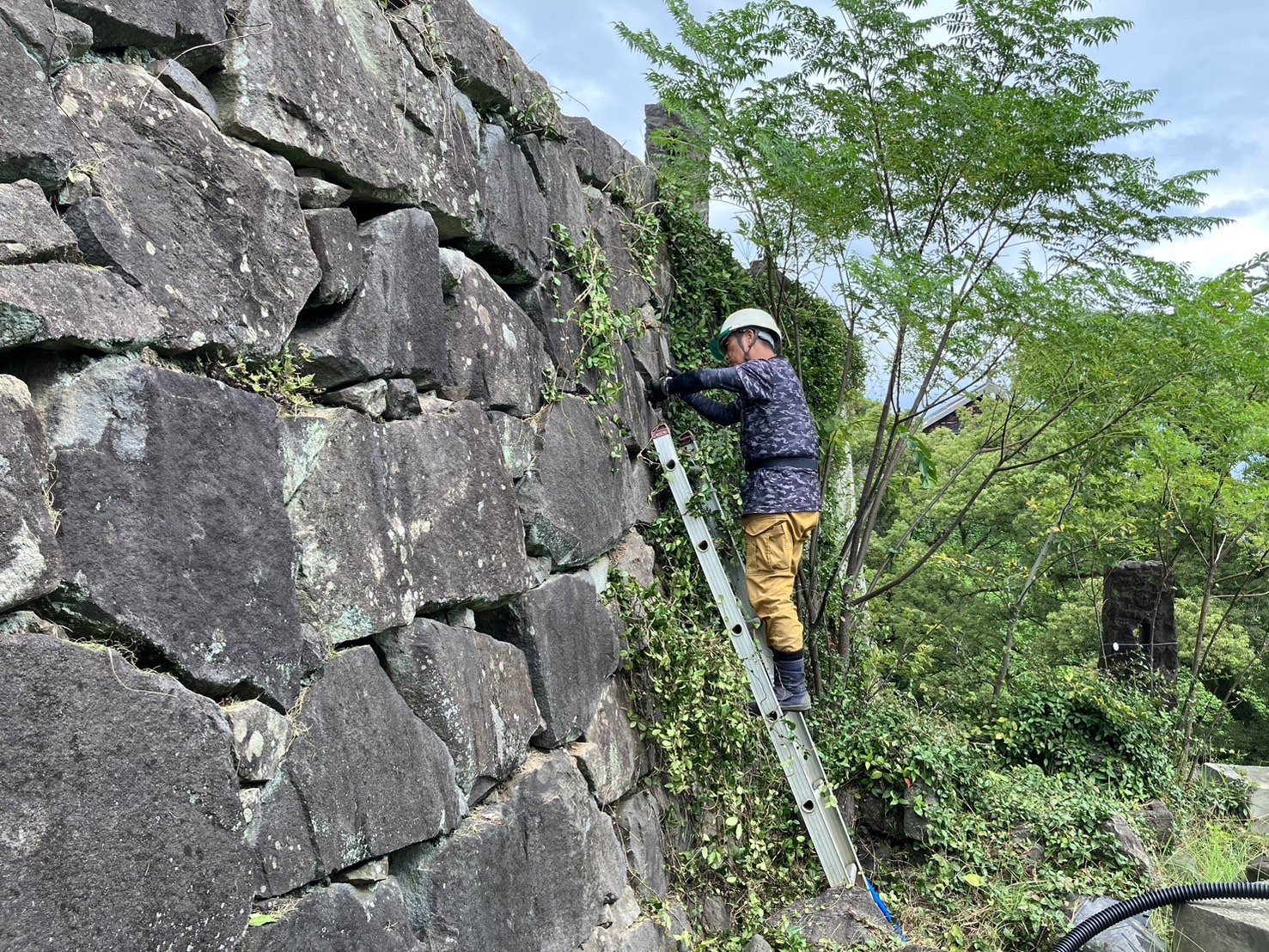 まずは石垣表面に張り付いたつる草や雑木を切っていきます。