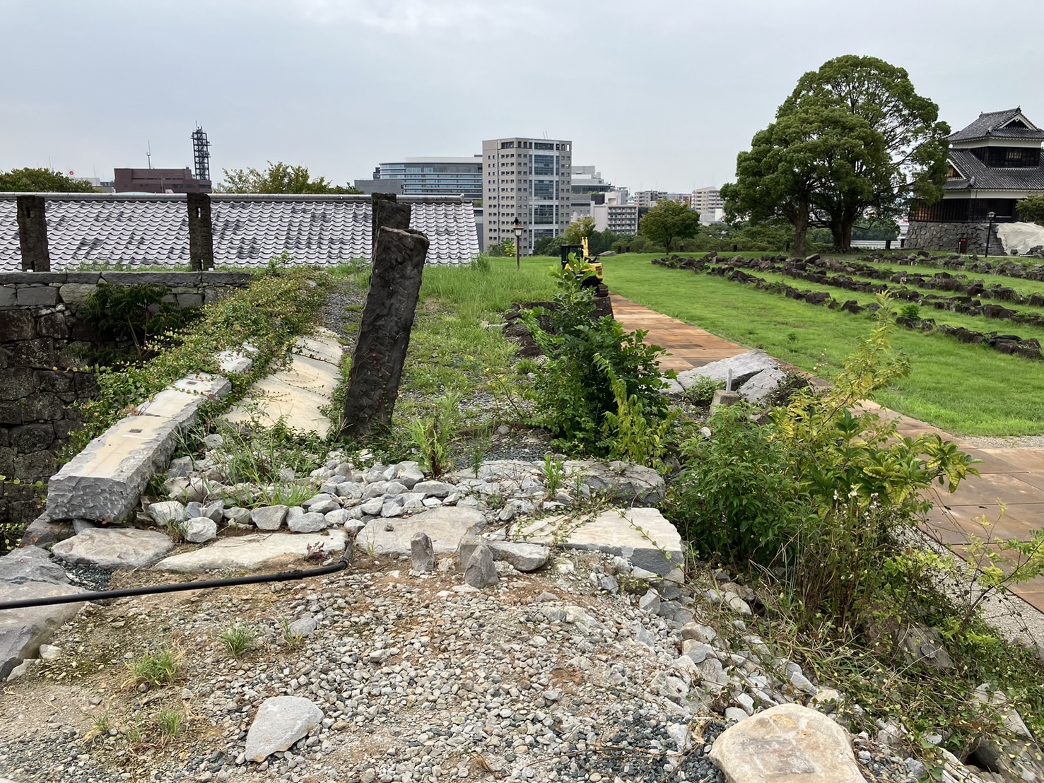 この工事では、崩れてしまった石垣の修繕を目的として、崩れて瓦礫に埋まってしまった築石(石垣の表面に見える主な石材)を掘り出し管理する、石垣の崩壊を防ぐ措置を施すことを目的として作業しております。