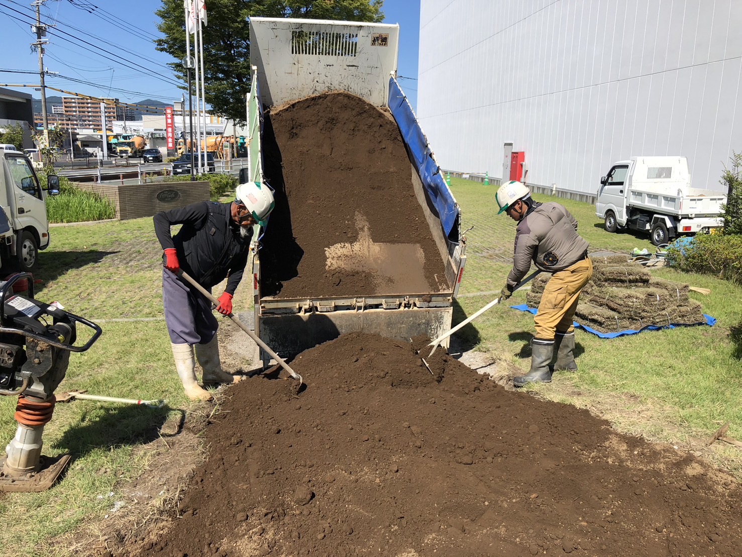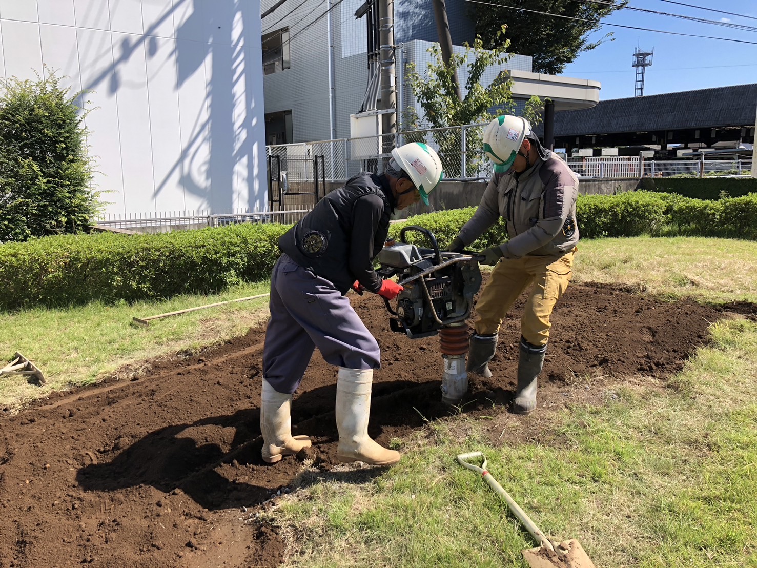 しっかり転圧しないと土の中に空気が残り、時間が経つとそこだけ沈んだ状態になるので転圧作業は隙間なく丁寧に行います。