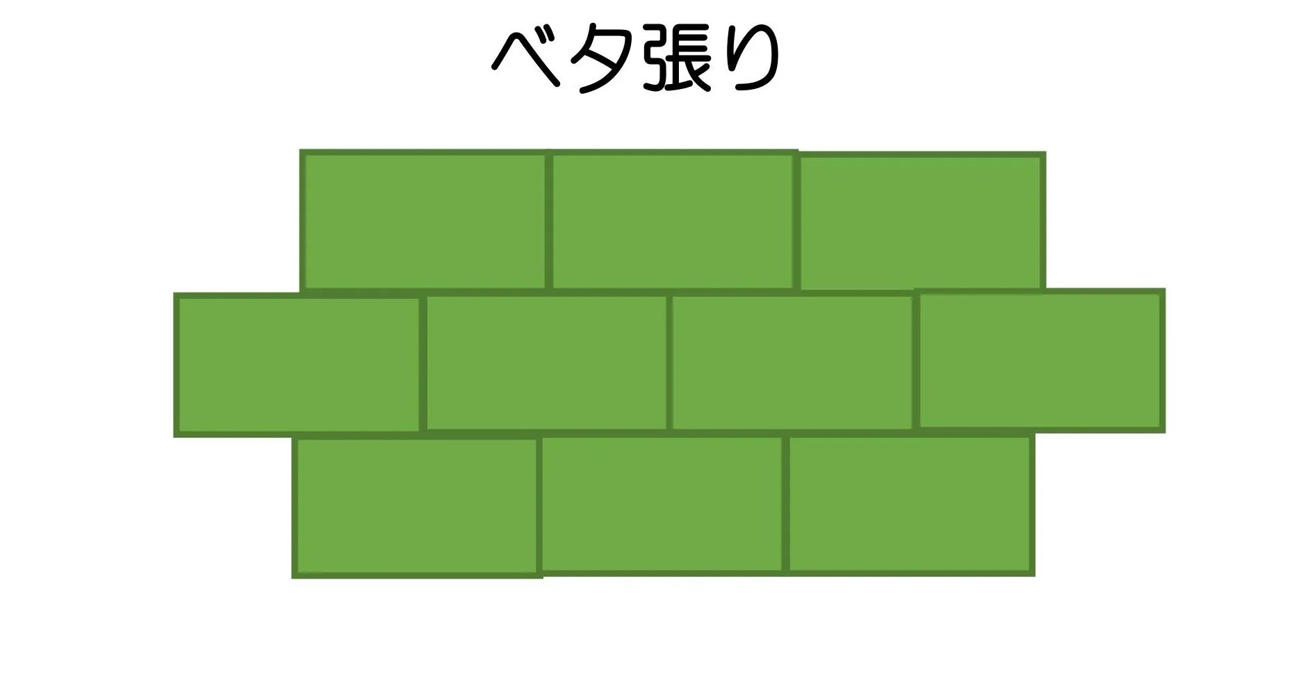 べた張りは芝生を千鳥張りしていくやり方で、目地が少なく雑草が生えにくくなり管理がしやすくなる他、芝生が一体化しやすいというメリットがあります。