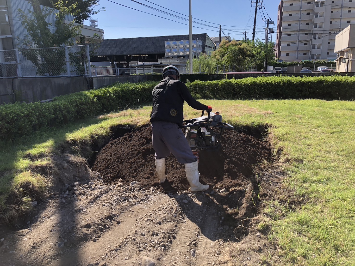 土を入れたら転圧、土を入れたら転圧、この作業を繰り返して穴を埋めていきます。