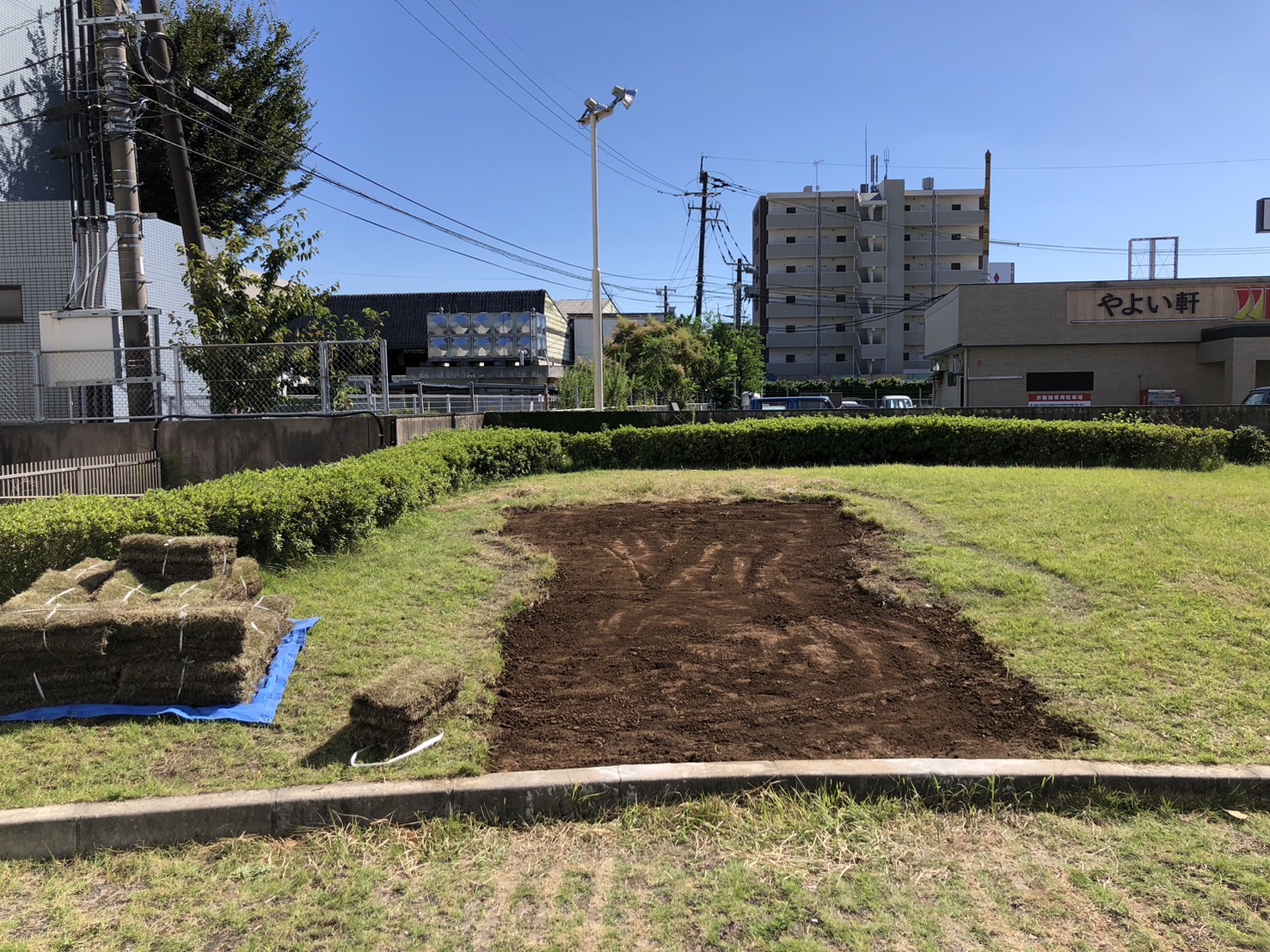芝生の真ん中に空いた穴、この穴はここにもともとあった石碑を撤去した際にできた穴で、このままにするわけにもいかず穴を埋めて芝生を植えることになりました。