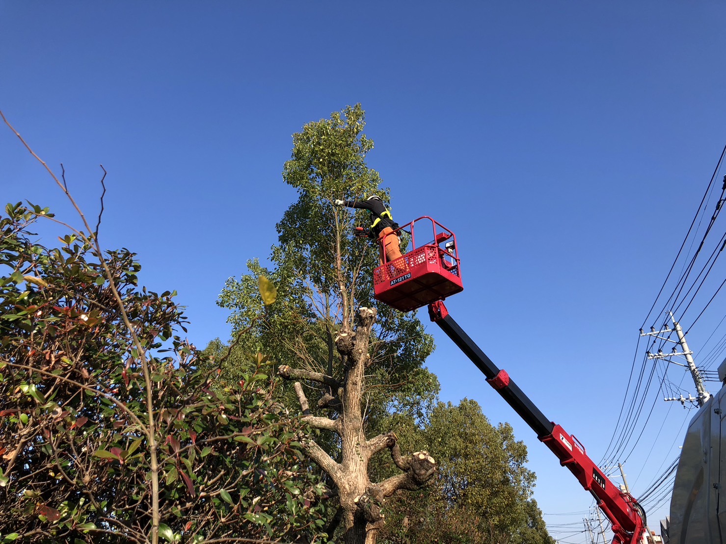 クスノキは、南部まちづくりセンターの正面入口の横に3本、道路沿いに3本、計6本生えており、作業車で登り剪定します。