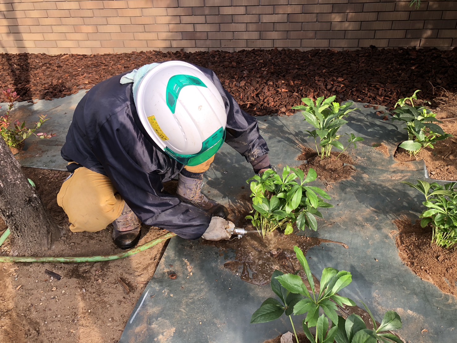 植栽が終わったら上からマルチゴールドを敷き均して完成です。