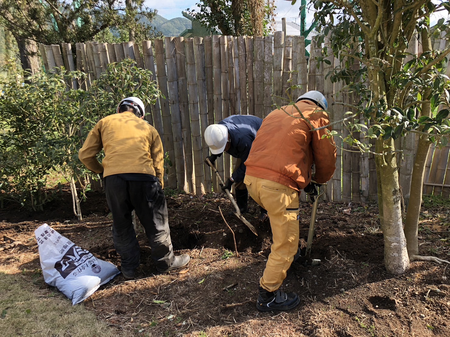 高さが同じになるように穴の深さを調整したり、植える向きを決めてモクセイを置いたら最後に堆肥を混ぜながら植えていきます。