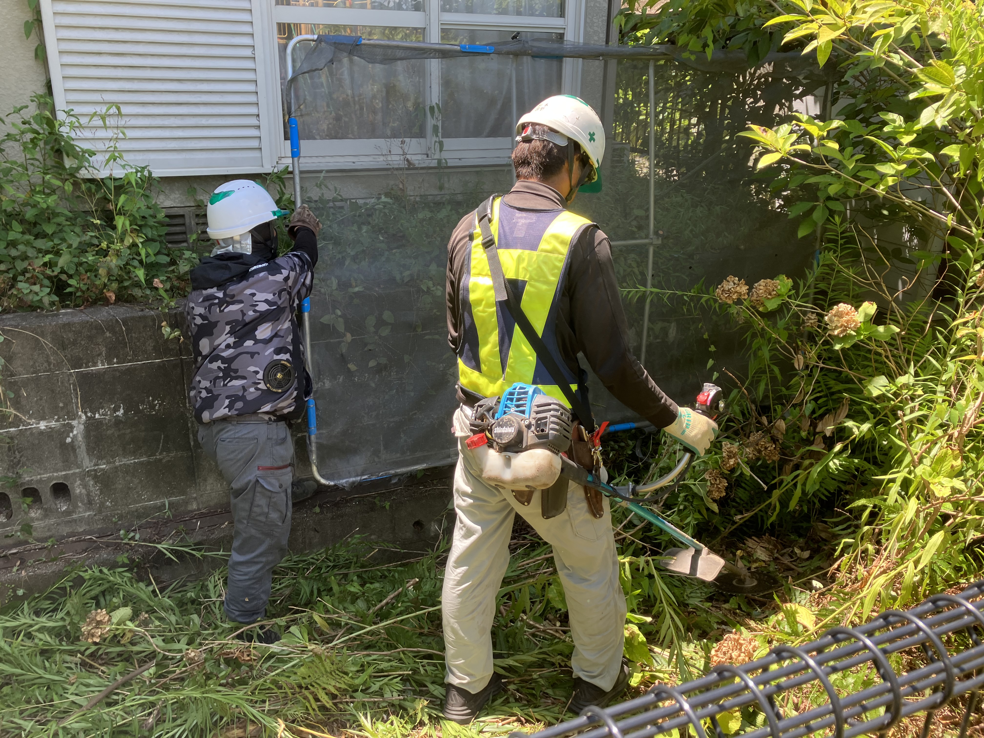 奥の方の民家の方にスズメバチの巣が出来ており、刺激しないように慎重に作業していきます(筆記者は小さい頃ハチの巣に拳一つで挑み、刺されたことがあるのでそれ以降蜂がトラウマなので、可能な限り近づきません)。