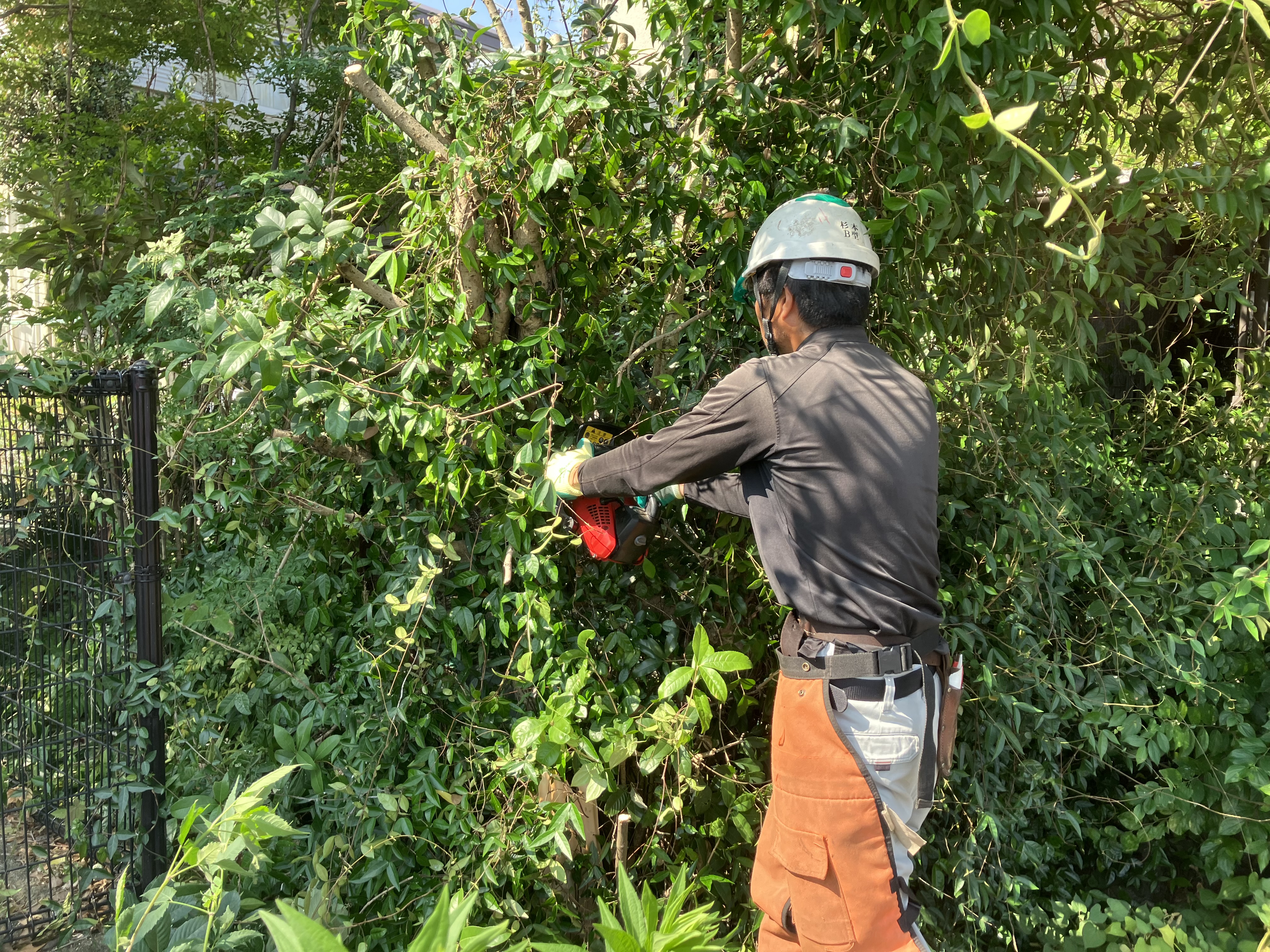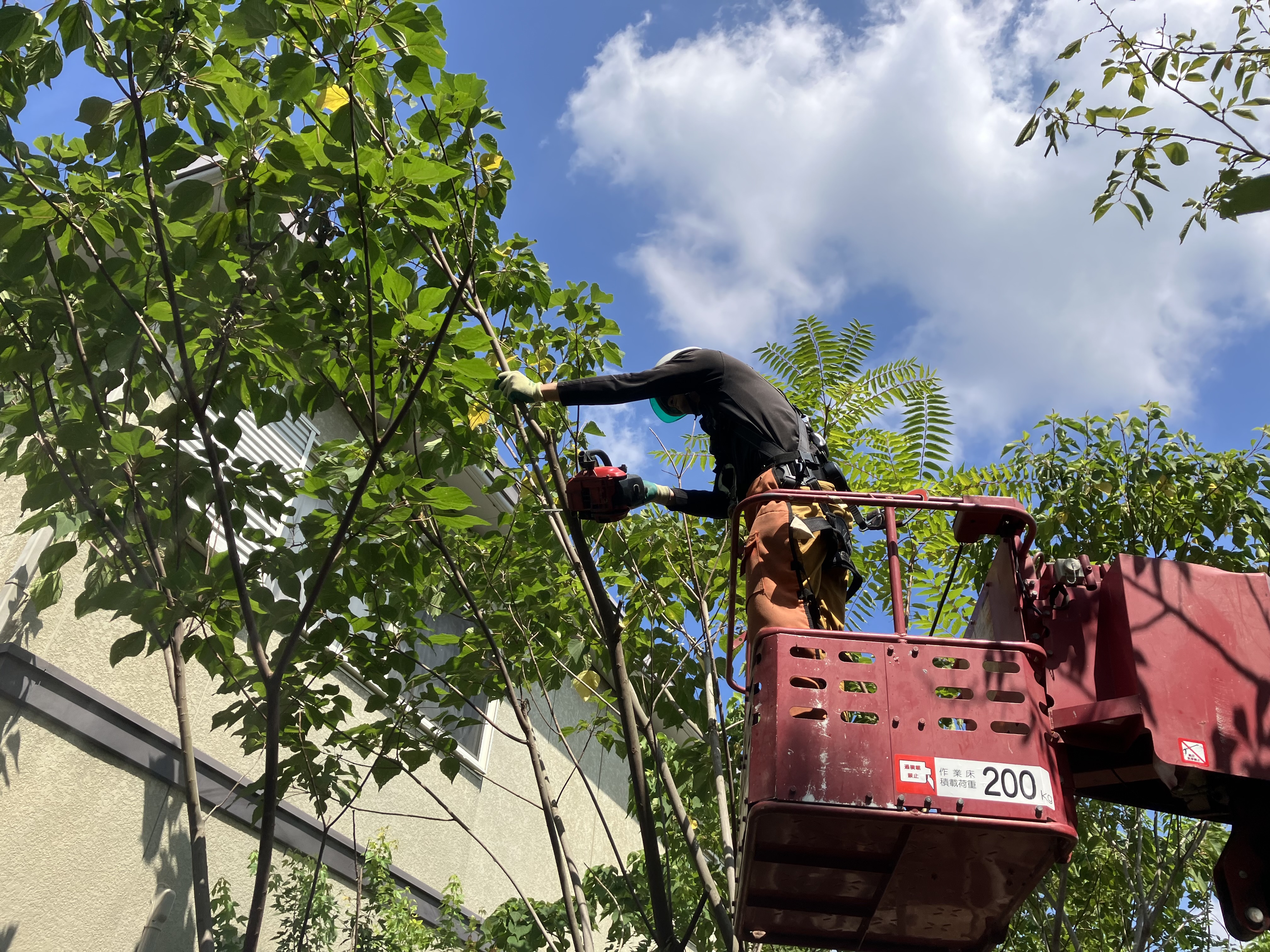 残った樹高が高い雑木は高所作業車を使って伐採してきます。