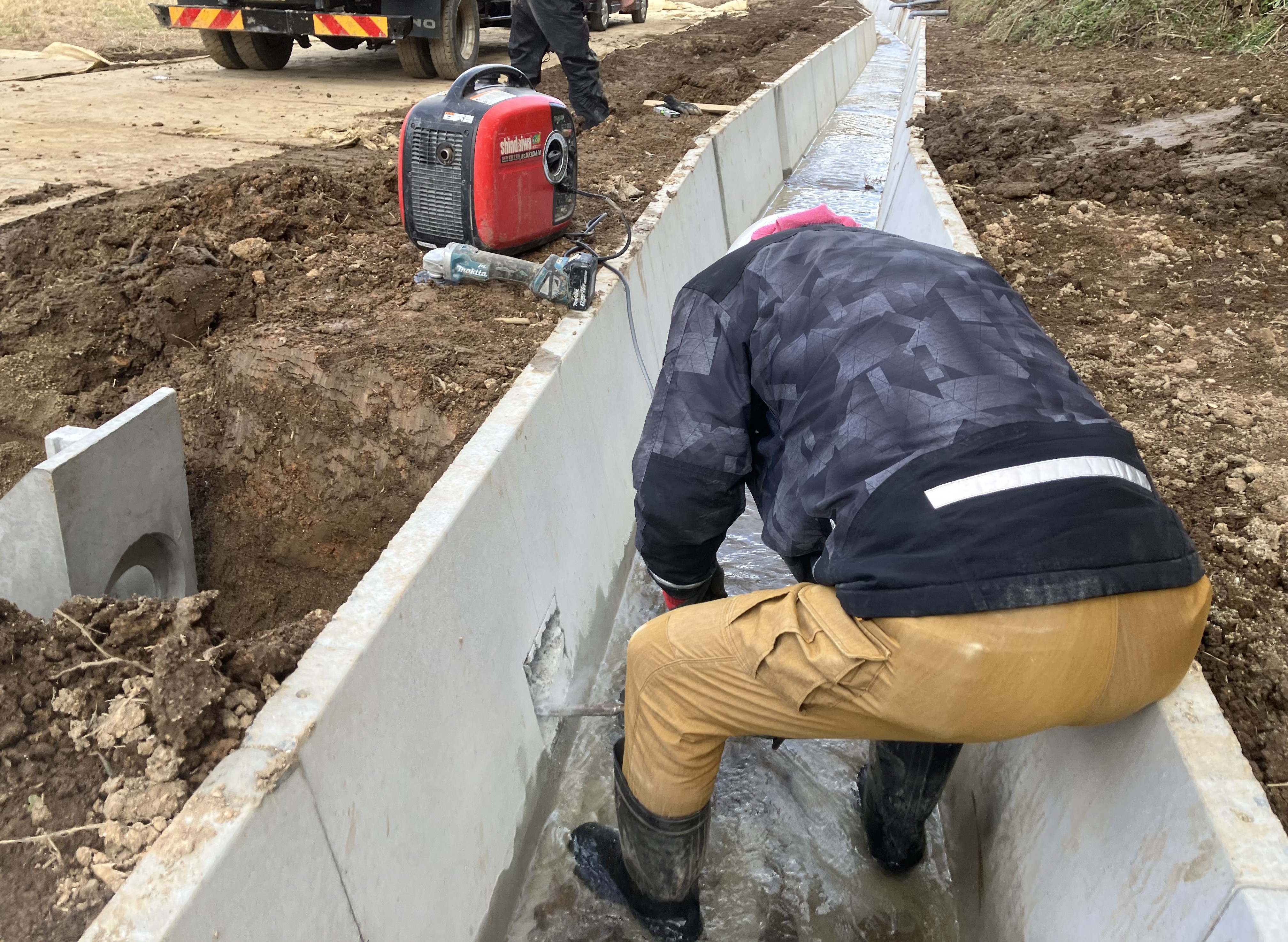 穴を開けたらパイプをいれ、排水桝を取り付けます。