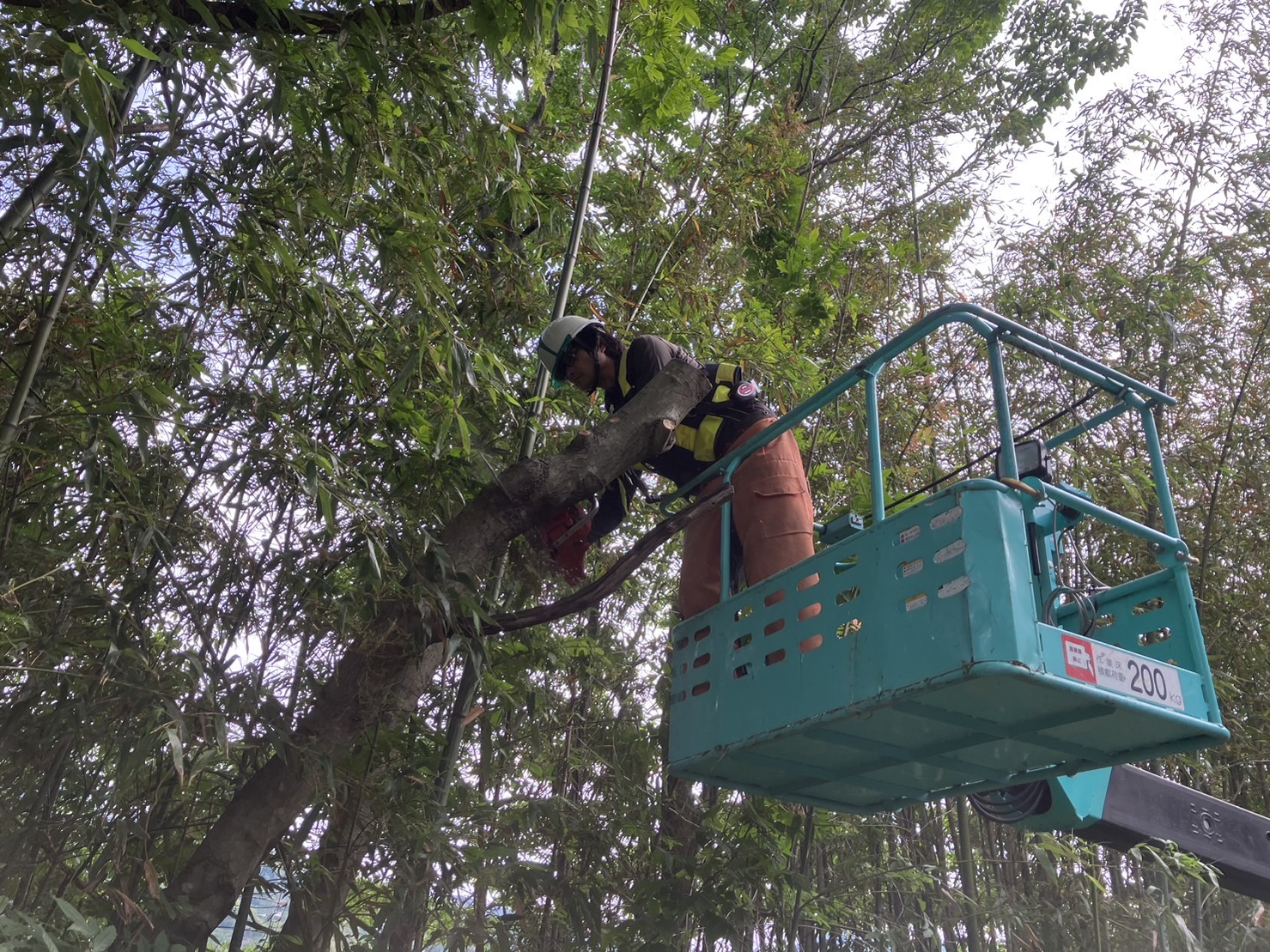 樹木が生えてる所はかなり急な坂道で、草も生い茂ってる状態なので切った物をそのまま落とすわけにはいかず、太い枝や幹はユニックで吊り上げて運びます。