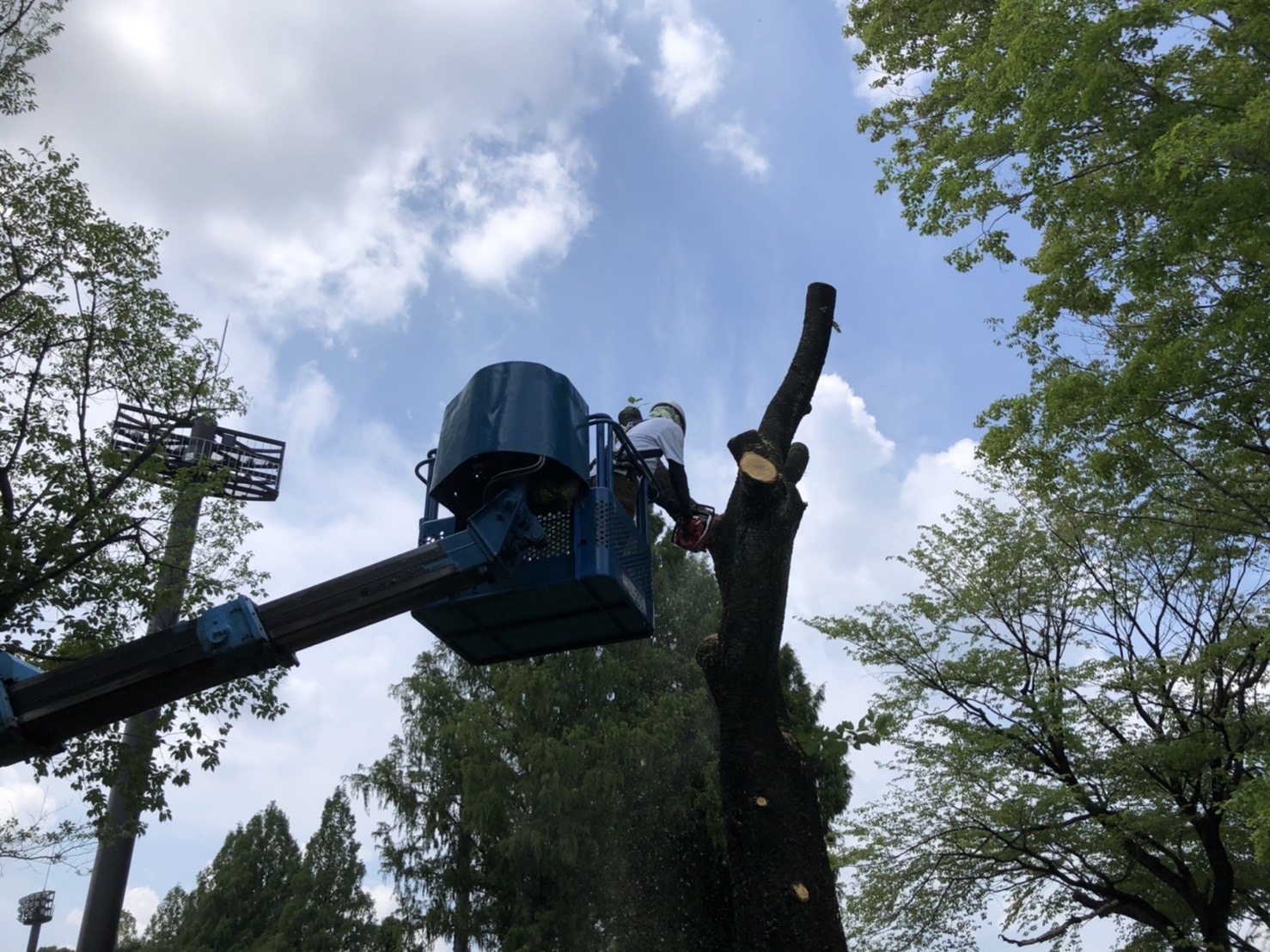 高所作業車を使っての作業のため、現在法令で定められている墜落制止用器具の着用を徹底し、安全に作業をすることが出来ました。