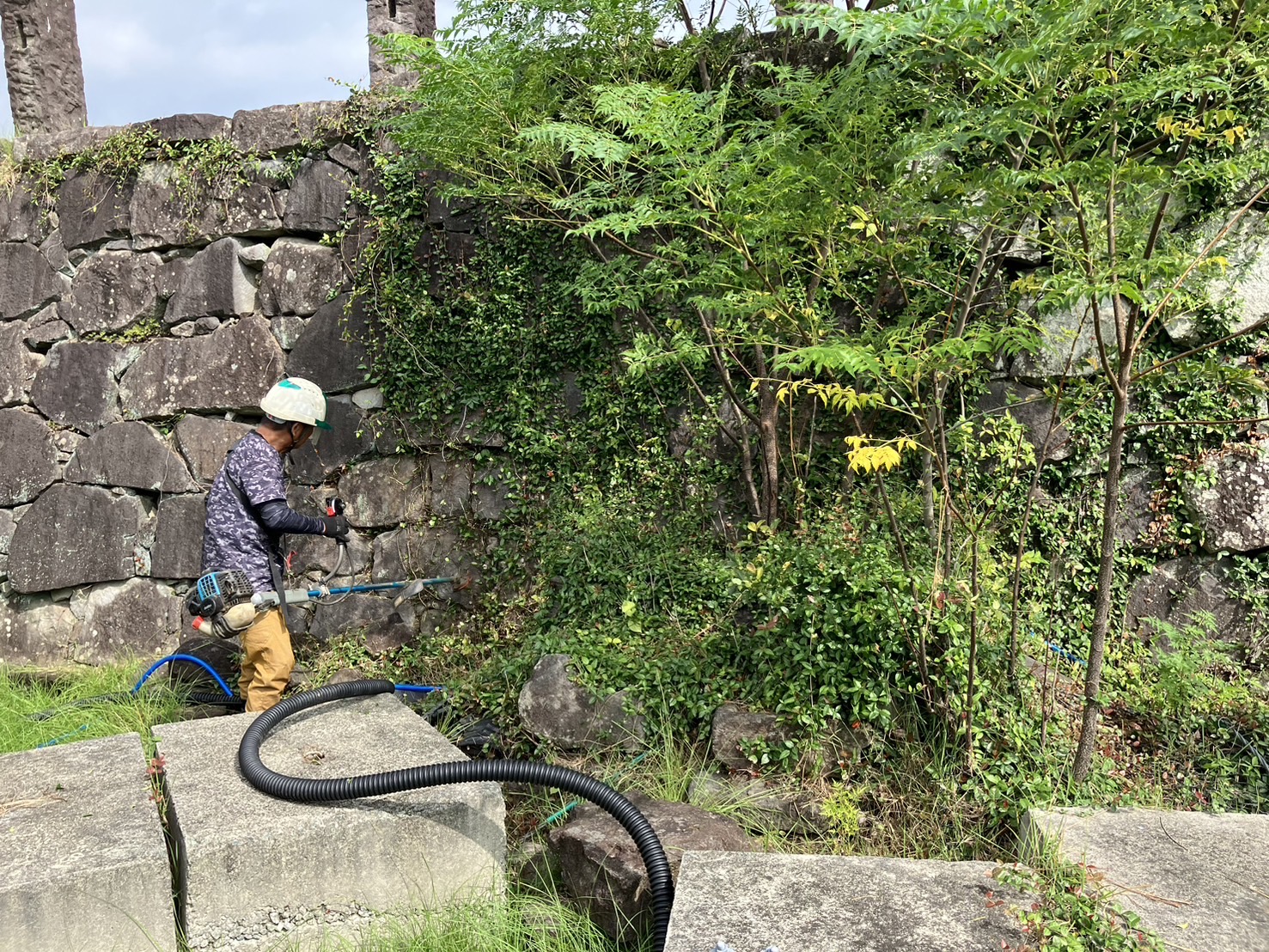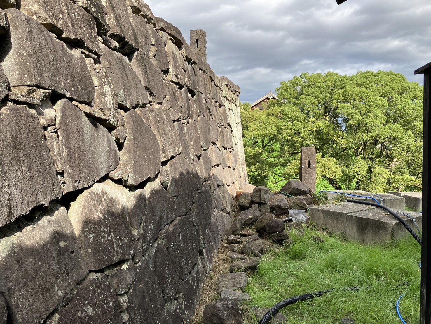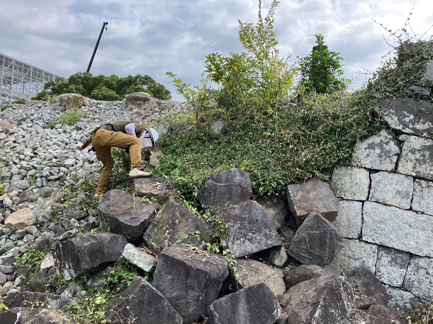 この工事では、崩れてしまった石垣の修繕を目的として、崩れて瓦礫に埋まってしまった築石(石垣の表面に見える主な石材)を掘り出し管理する、石垣の崩壊を防ぐ措置を施すことを目的として作業しております。