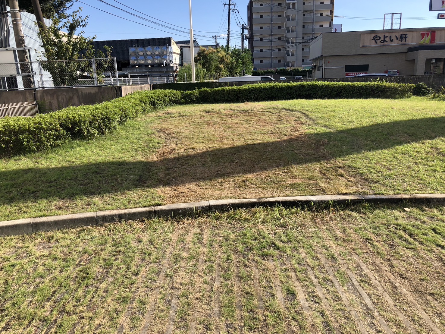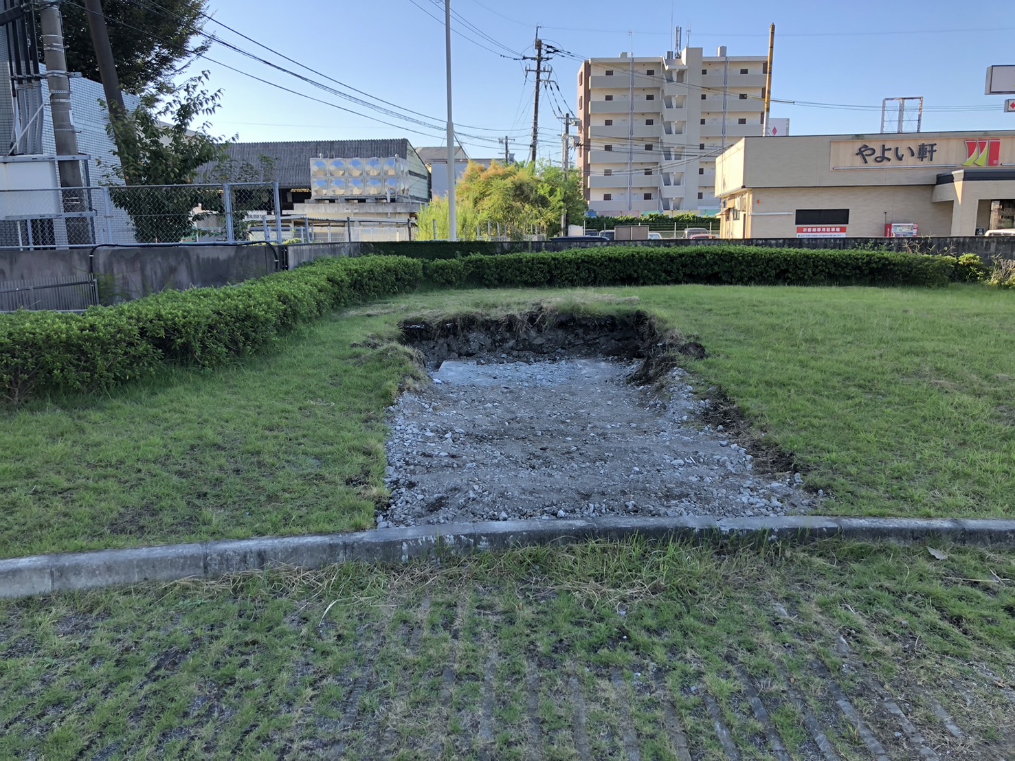 芝生の真ん中に空いた穴、この穴はここにもともとあった石碑を撤去した際にできた穴で、このままにするわけにもいかず穴を埋めて芝生を植えることになりました。