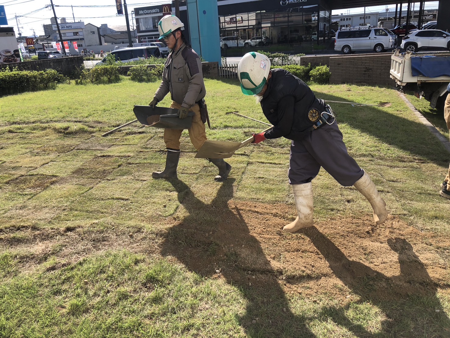しっかり転圧しないと土の中に空気が残り、時間が経つとそこだけ沈んだ状態になるので転圧作業は隙間なく丁寧に行います。