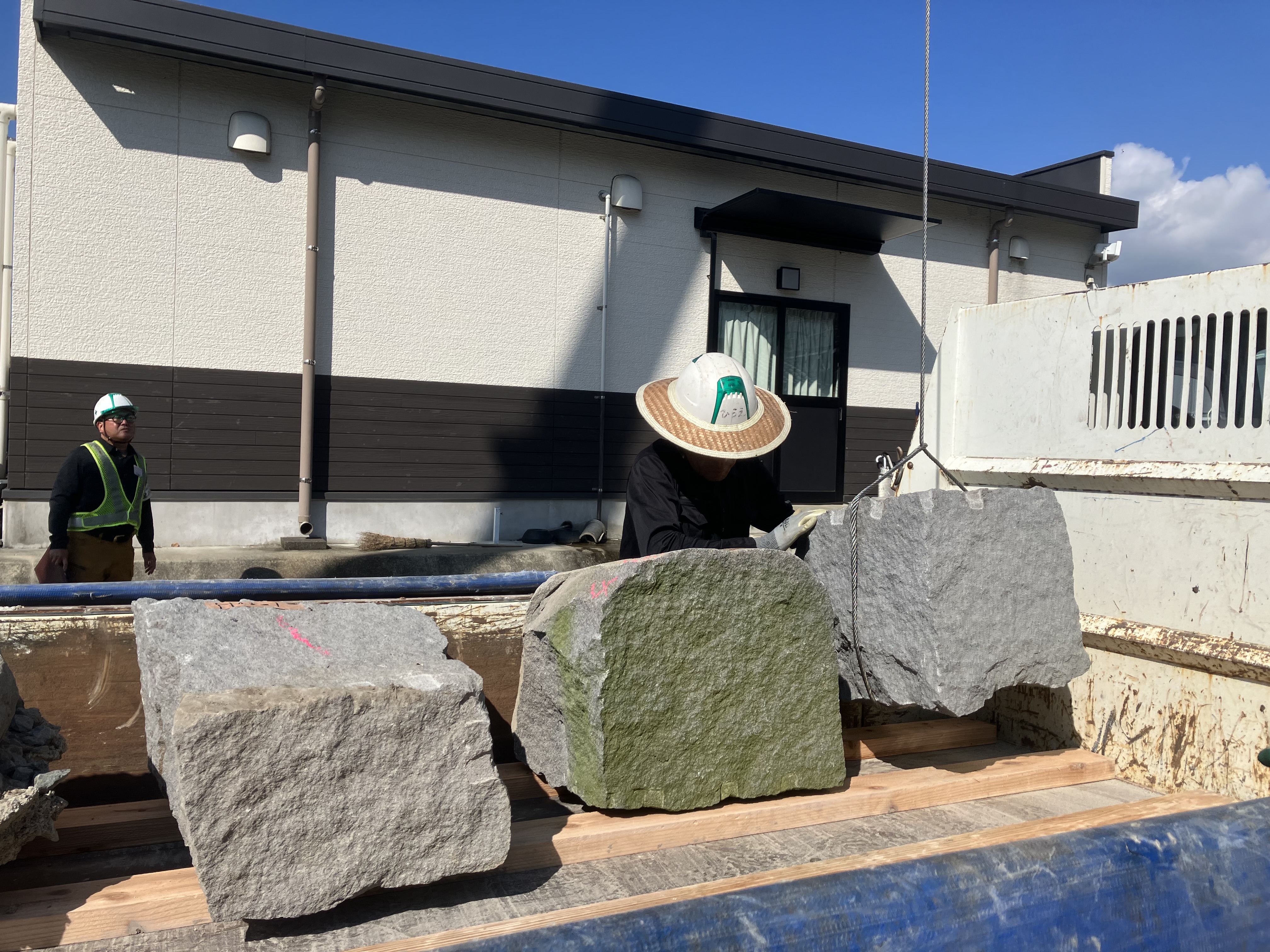 移動させる時も築石が欠けないように一個一個丁寧にクレーンで吊り上げてから移動させます。