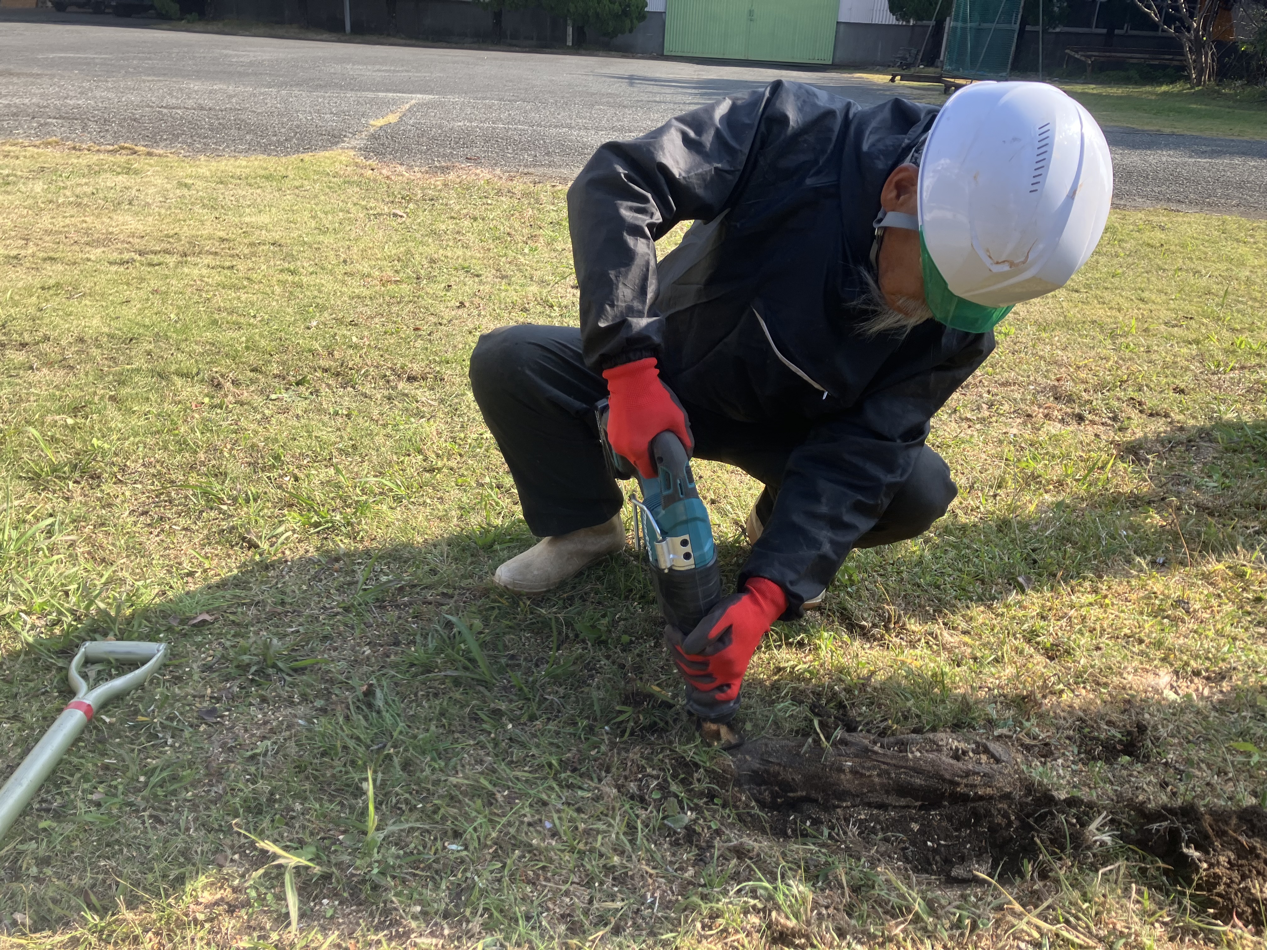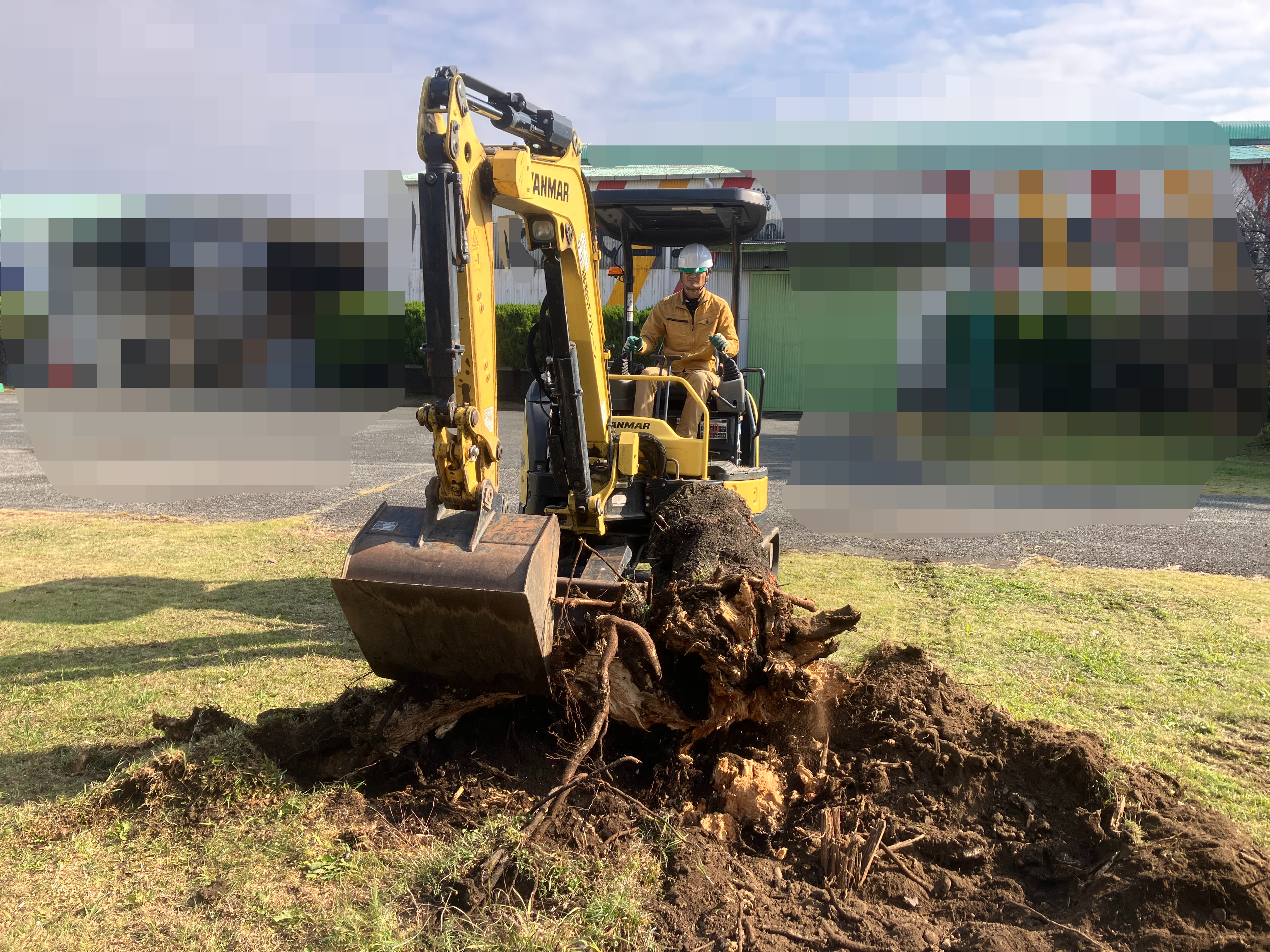 幹や枝はボロボロでしたが、根っこはしっかりした状態で残っていたので、バックホウで丁寧に掘り起こし浮き出た根っこは電動のこぎりで切断します。