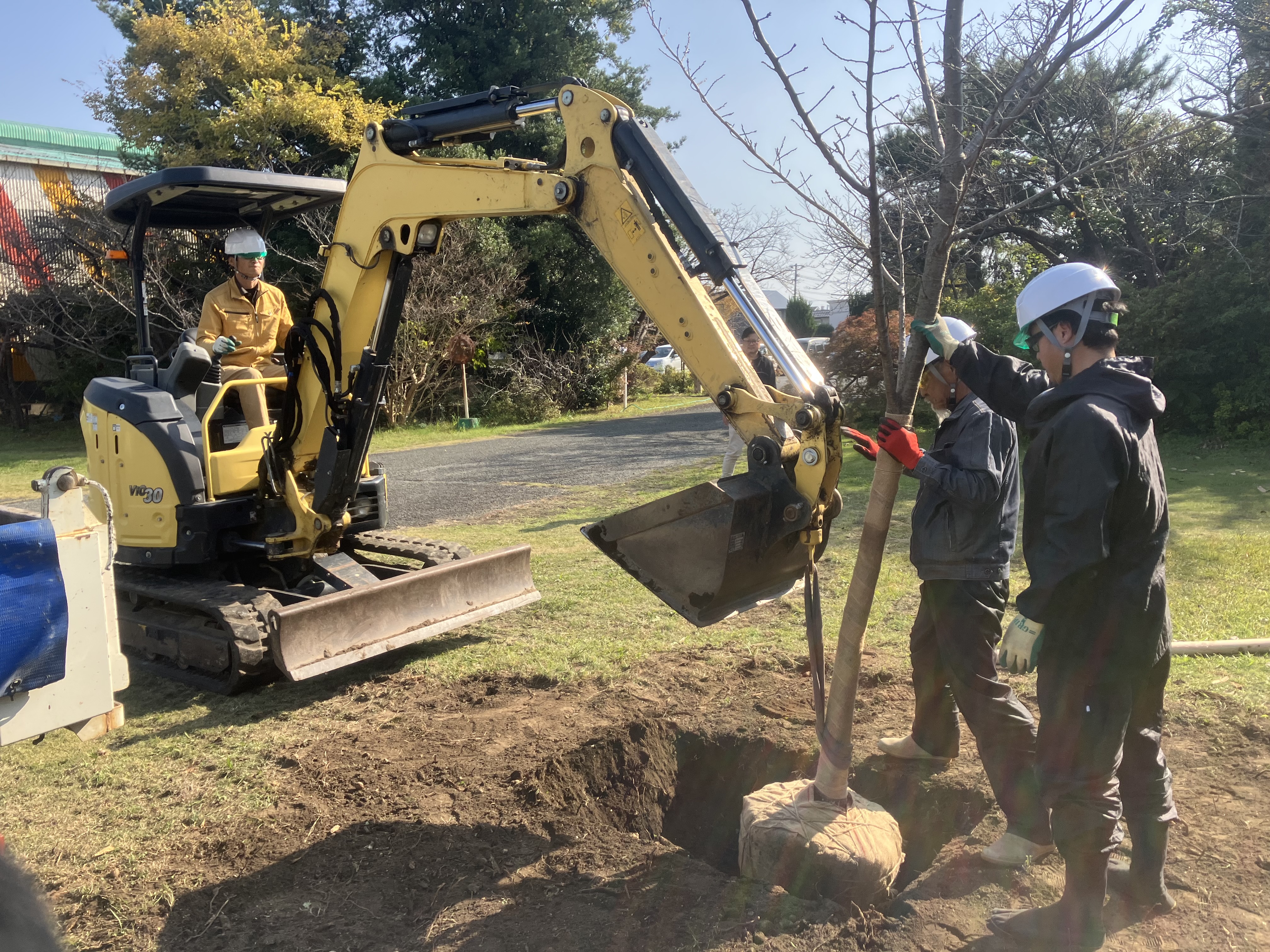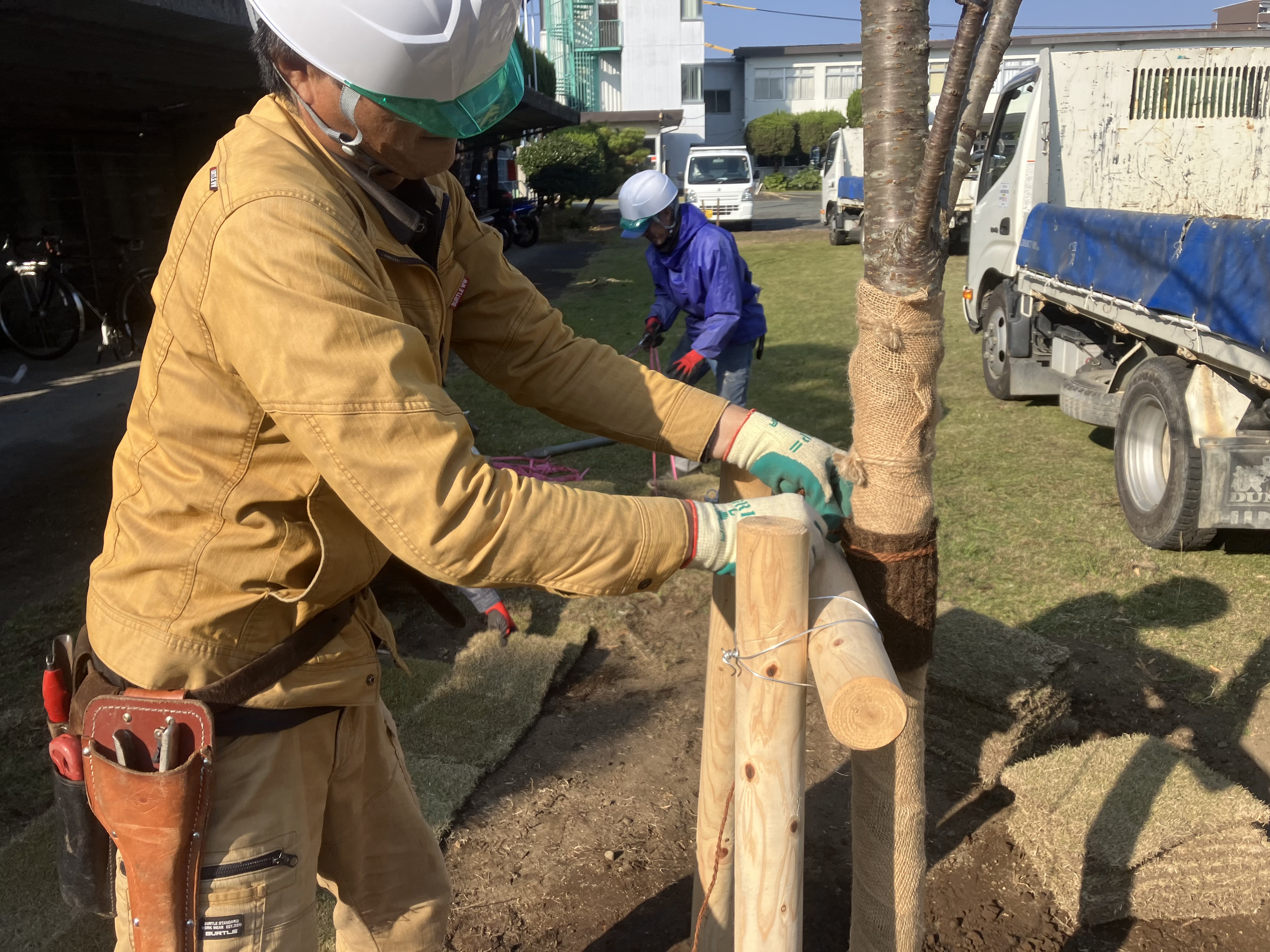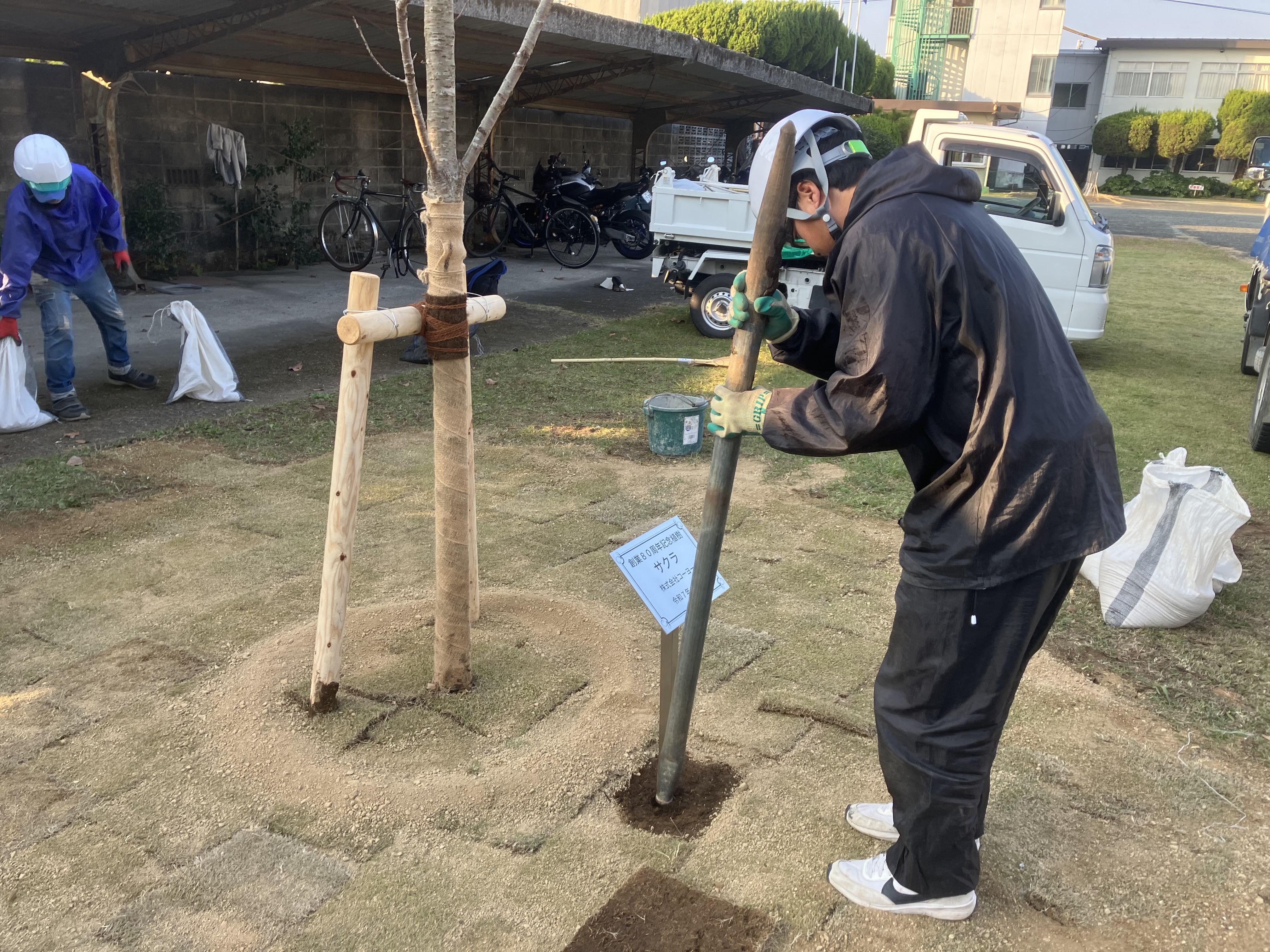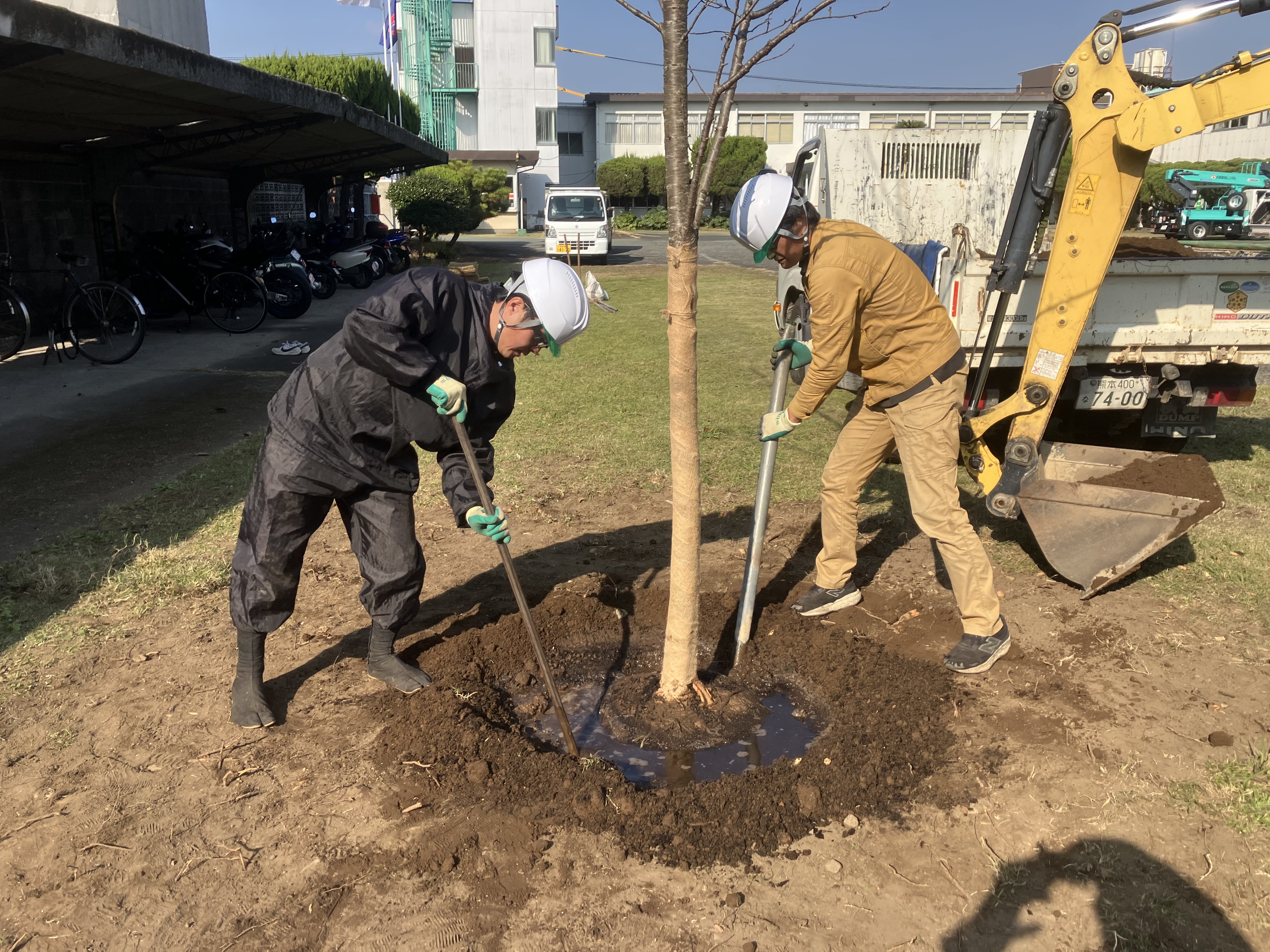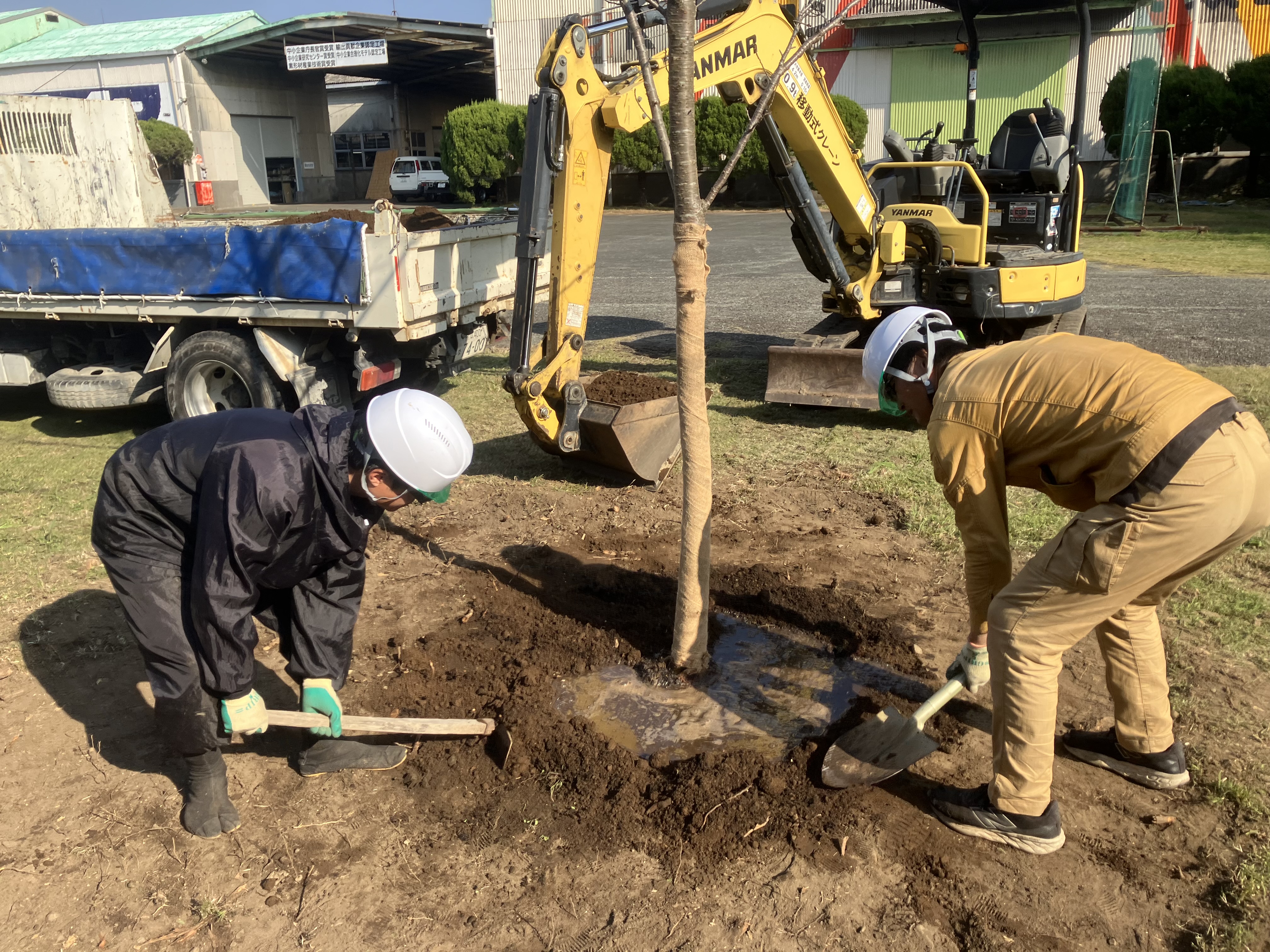 植栽用の穴を掘り桜を入れたら桜の向きや角度を調整しながら穴を埋めていきます。